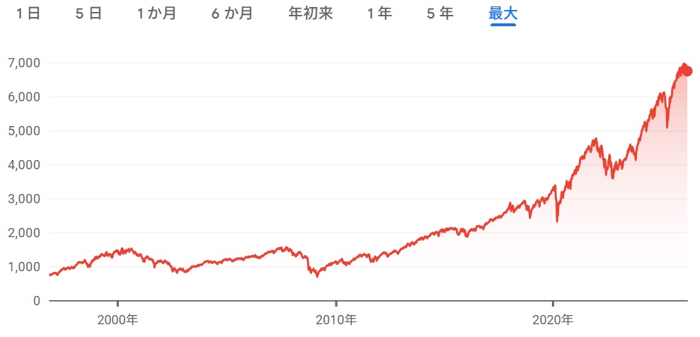 S&P500は歴史的に安定して成長しており、リーマンショックやコロナショックといった経済危機で下がるときもありつつ、長期的に右肩上がりの優良指数です。