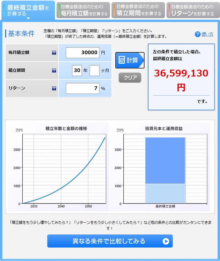 毎月3万円をeMAXISSlim米国株式(S&P500)は設定日が10年未満のためS&P500指数の今までの平均利回り約7%で30年間で計算します。