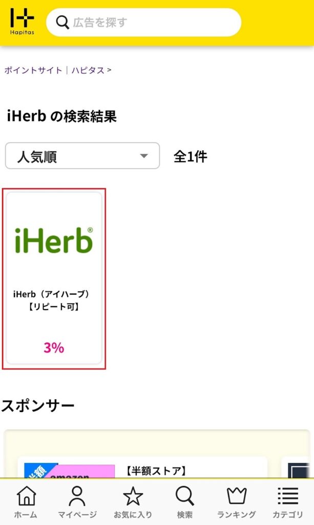 - ステップ②ハピタスで「iHarb(アイハーブ)」と検索して案件ページを開く