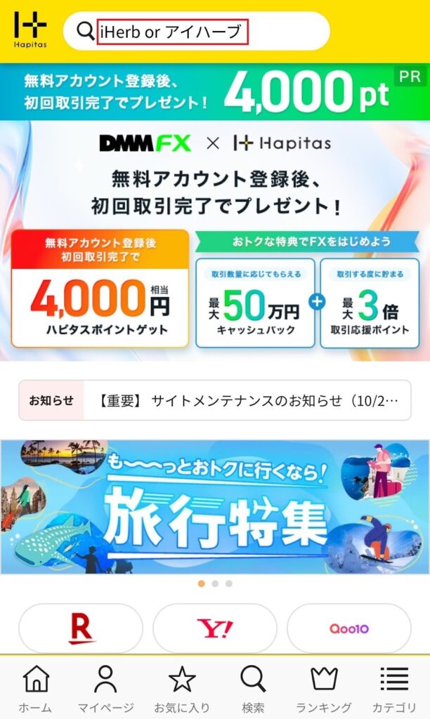ハピタスにログインしたら、画面上部の検索バーに「iHarb」か「アイハーブ」と入力して検索します。