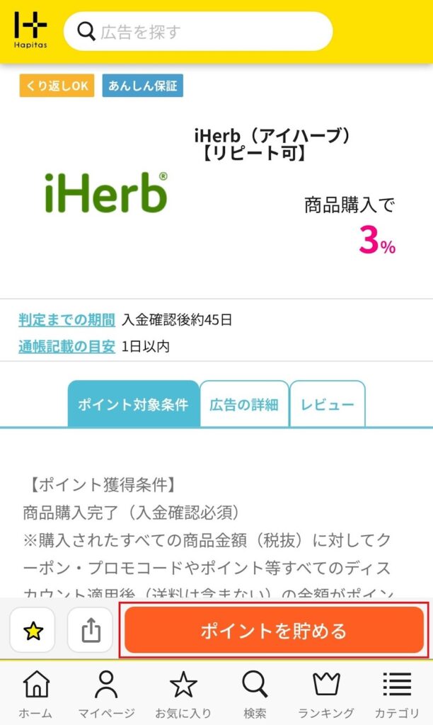 iHarb(アイハーブ)の案件ページの「ポイントを貯める」を押すとiHarb(アイハーブ)の公式サイトに移動します。