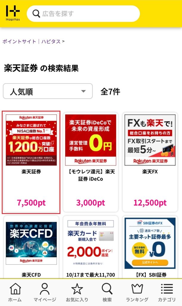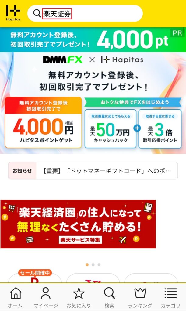 登録後、ハピタスの検索バーに「楽天証券」と入力して検索します。