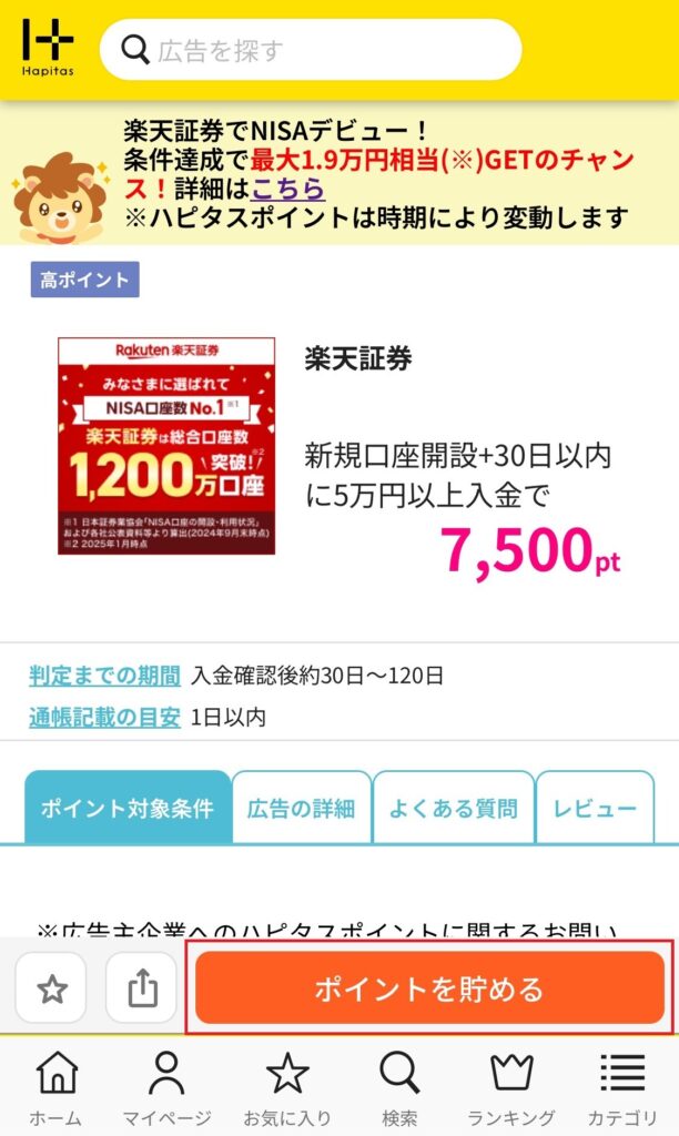 楽天証券の案件ページの「ポイントを貯める」ボタンを押すと、楽天証券の公式サイトに移動します。